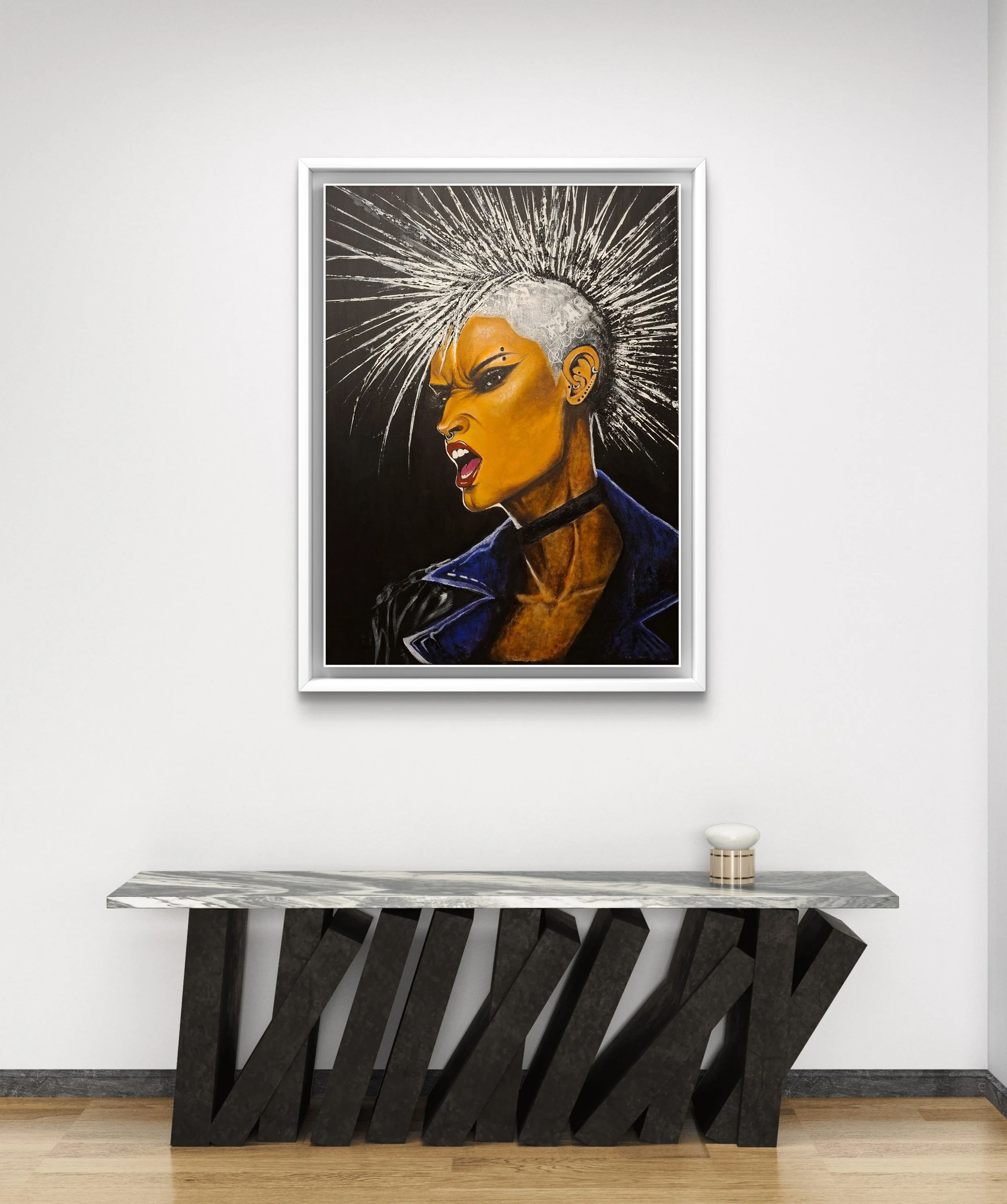 This piece celebrates the power of presence and mystery. Vibrant colours explode across the canvas which invites curiosity and letting the energy and strength speak for itself. It is a bold exploration of identity, empowerment and the beauty of what we choose to reveal.